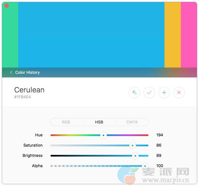 如果你对取样的调色板的颜色还不是很满意,就可以通过编辑功能手工调整他们在 RGB/HSB/CMYK 下的红绿蓝三色通道和 Alpha 通道数值,同时也可以自由编辑颜色的名称。 对于完成的调色板你还可以通过 .ase .crl 等多种格式分享给同事,提供工作协同效率。