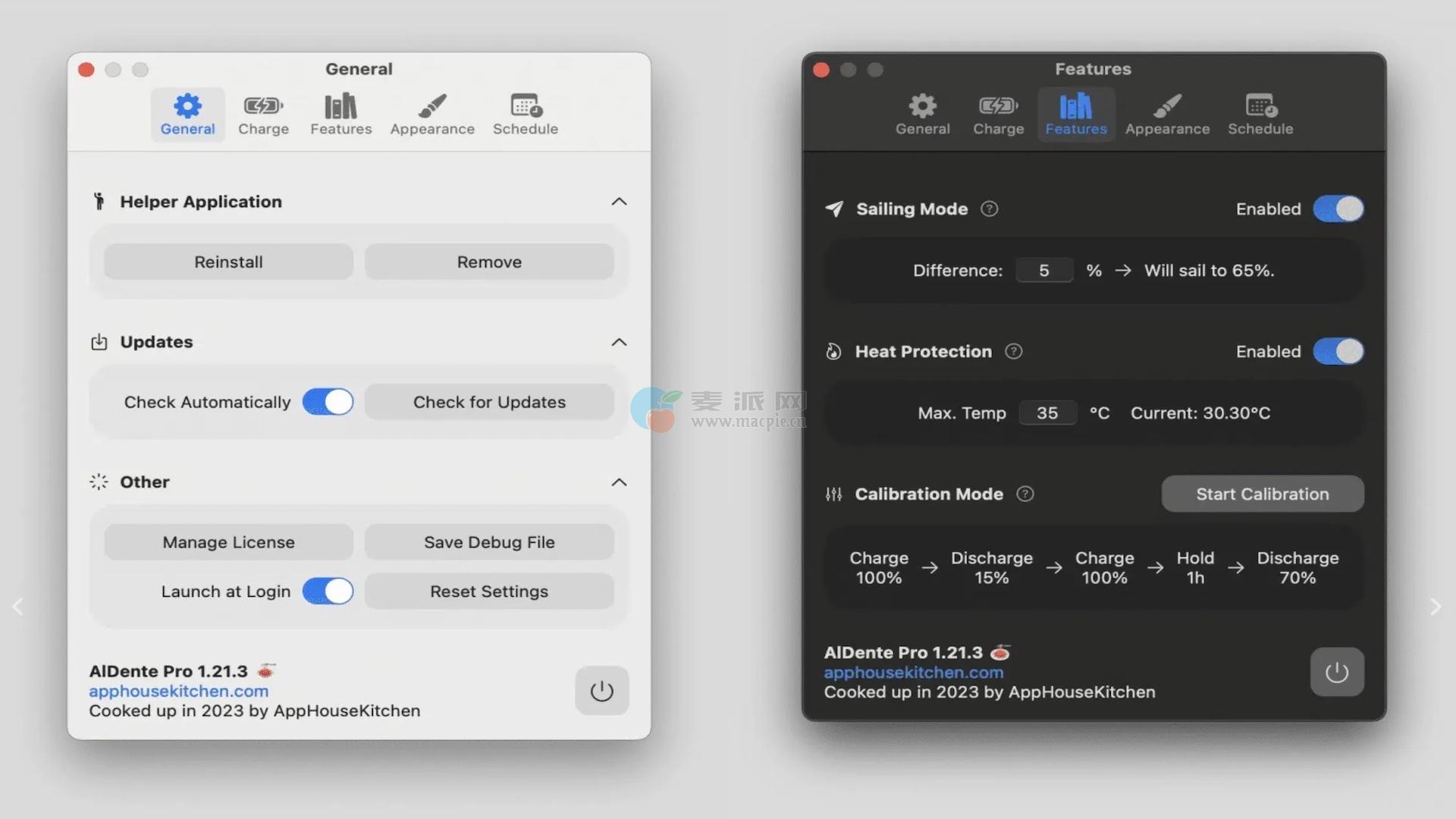 AlDente Pro是一款适用于Mac操作系统的小工具,可以帮助您限制电池充电量以延长电池寿命。通常情况下,电池在充满的状态下会继续接受电源充电,这可能会导致电池寿命缩短。使用AlDente Pro,您可以设置电池只充到特定的充电水平,例如80%或90%,从而减少对电池的压力,延长其使用寿命。除此之外,AlDente Pro还提供了一些其他功能,如在菜单栏中显示当前电池状态、提醒您电池电量低等。