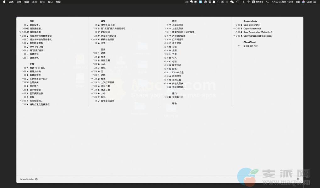 CheatSheet是一款Mac上的非常实用的快捷键快速提醒工具,你只需要按住Command键 ,就会弹出当前应用的所有快捷键列表,所以你记不住一些软件的快捷键没有关系,只需要使用 CheatSheet,随时提醒你当前软件的所有快捷键,比如Safari、Finder、Photoshop等简单实用。