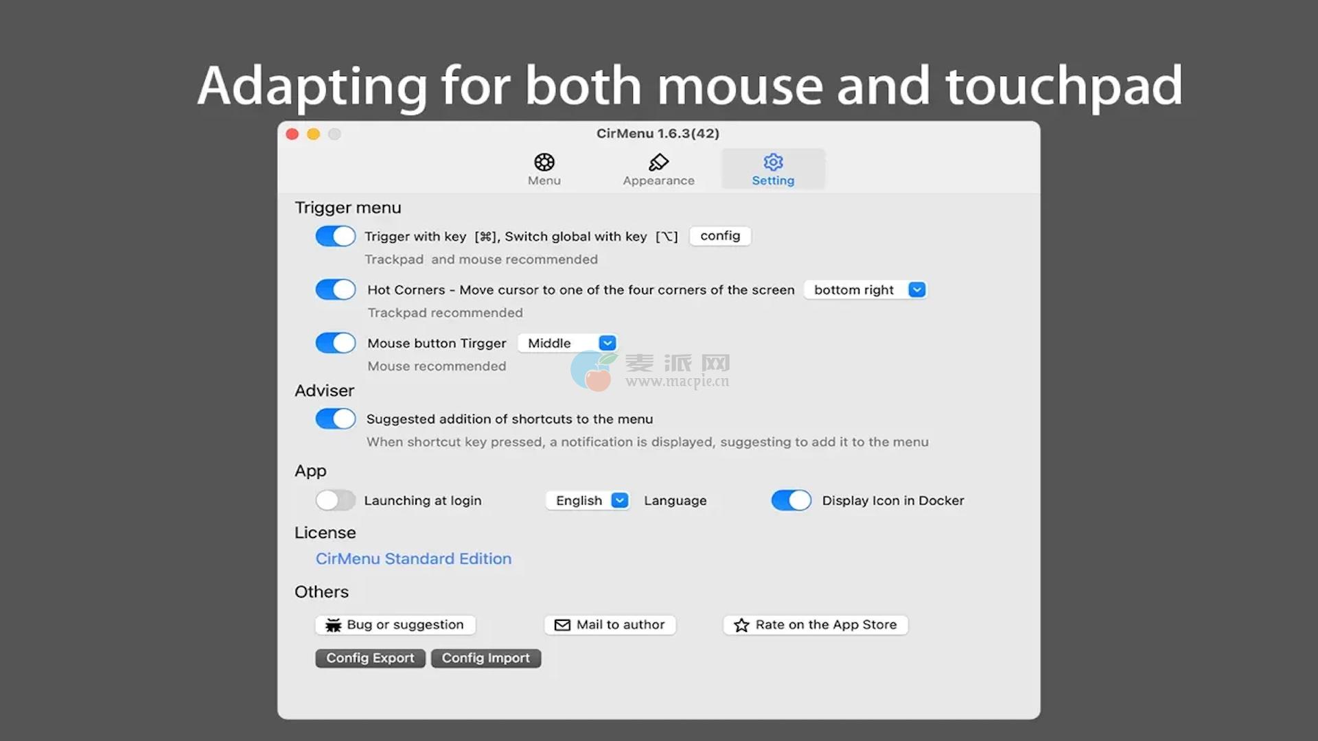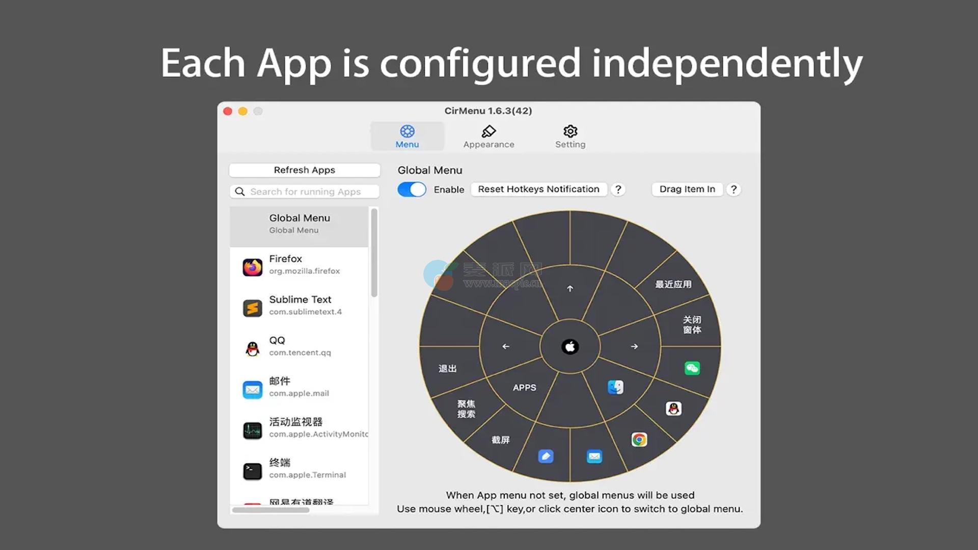CirMenu是一个实用程序,它提供了一个粘性(圆形)菜单,可以快速访问热键或触控板/鼠标手势引起的应用程序、文件、链接和文本,允许您为每个应用程序配置自己的圆形菜单,以实现即时快捷方式和操作。