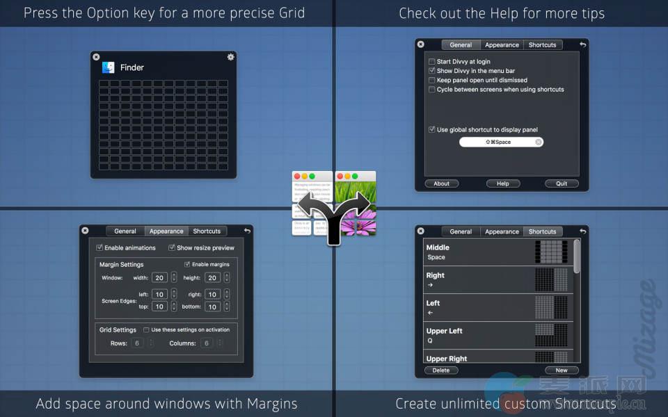 Divvy for mac是Mac os平台上的一款帮助用户管理自己的窗口的工具,这个功能简单的小工具,真的让窗口管理变得非常的简单。可以多样化的管理用户的窗口,所有的格子代表整个屏幕,而你可以通过拖拽这些格子,来设置当然窗口的位置和大小。