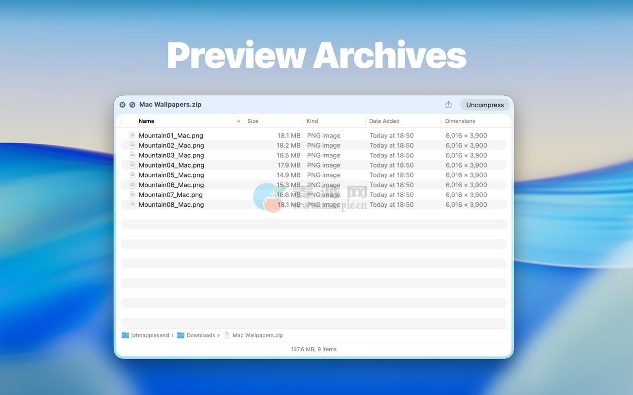 文件夹预览提供了一个快速查看扩展,可以在Finder中预览内容。开始之前,您必须在系统设置中启用快速查看扩展。然后,您可以按空格键或⌘ + Y在Finder中快速查找文件夹。您也可以右键单击列标题来显示或隐藏列。##支持的归档文件扩展名:- zip,- tar,- gz,- 7z,- rar。