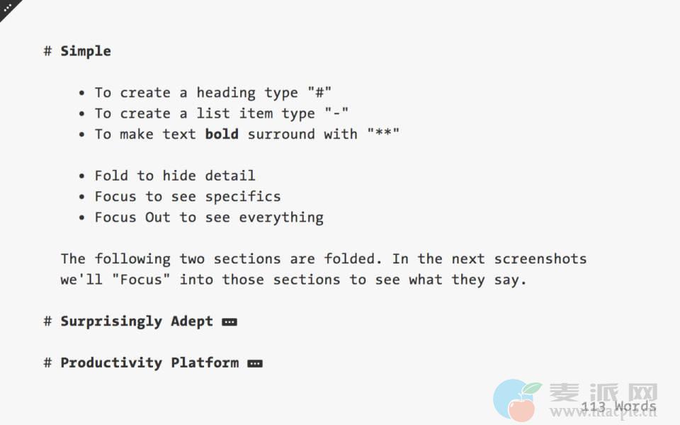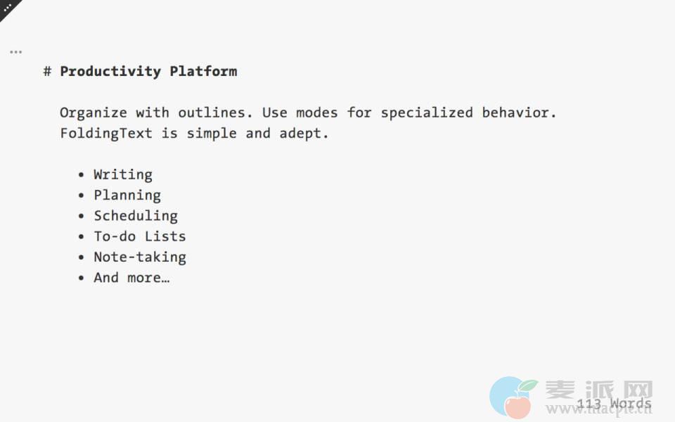 FoldingText for Mac的体积小巧,是一款轻量级的文本编辑器,然而它不仅功能多样,能够肩负写作、Coding等基础功能,还支持任务管理,事务定时/提醒、段落格式化、热键移动文本等功能,是一款非常不错的文本编辑软件。