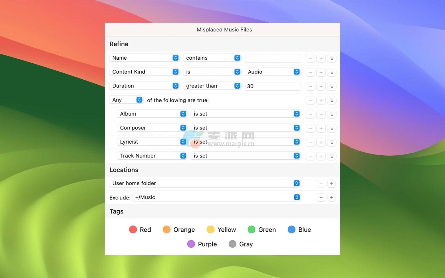 • HoudahSpot带有一组示例模板。“我的音乐”模板设置了用于查找音频文件的有用条件:作曲家,作词人,流派,比特率等。