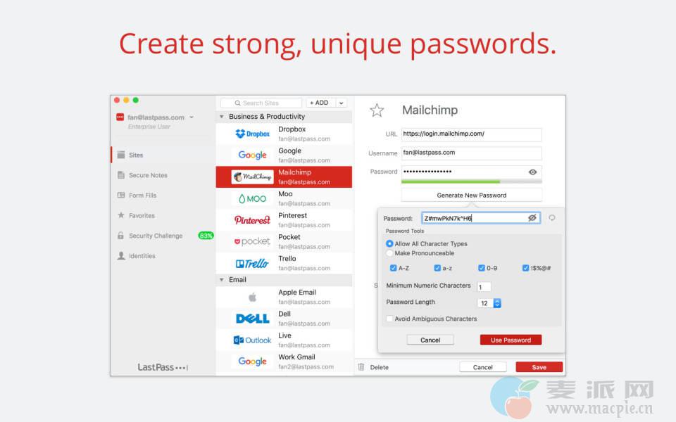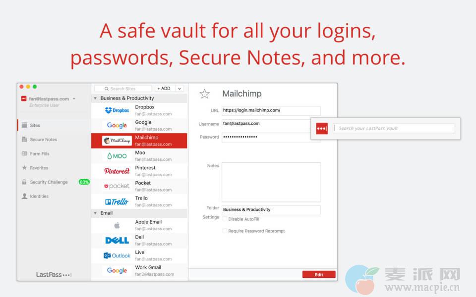 LastPass 是一款优秀的密码管理器,它能保管您的帐号密码并让您从任何电脑或移动设备上安全地访问。使用 LastPass 后,您只需记忆一个密码LastPass 的主密码。LastPass 会替您填写登录信息并在任何您需要的地方同步数据。