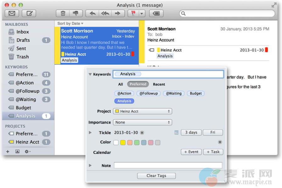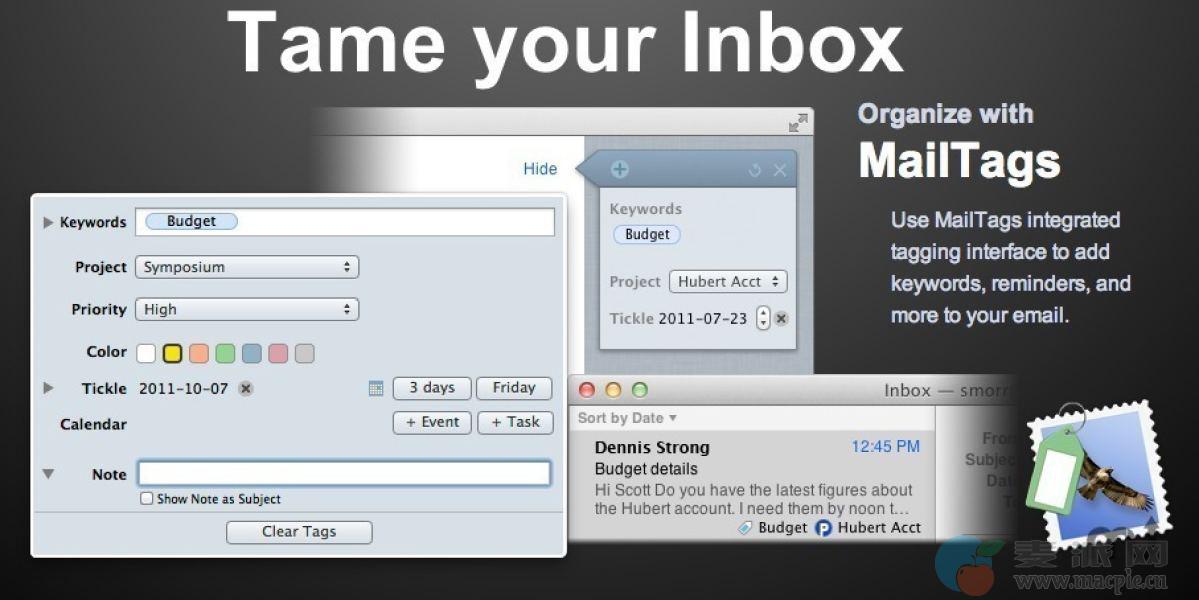Mailtags,组织你的邮件。可让您将留言,截止日期,项目说明和优先级排名添加到您的邮件中,而无需离开您的收件箱!是Apple Mail的一个功能齐全的随附软件。