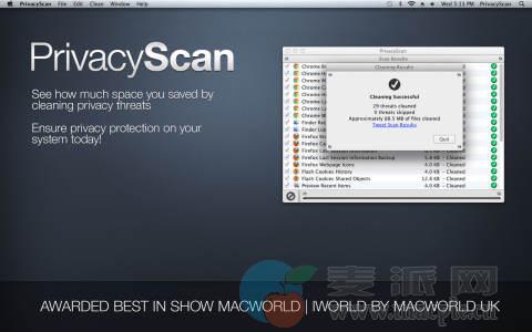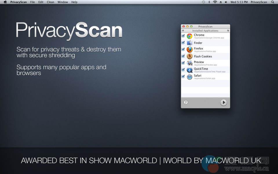 PrivacyScan安全地删除用于跟踪您的计算机使用情况和在线行踪的文件,包括互联网浏览历史记录,缓存文件,Cookie,搜索历史记录,最近的项目等等。Apple隐私问题可能已成为过去。
