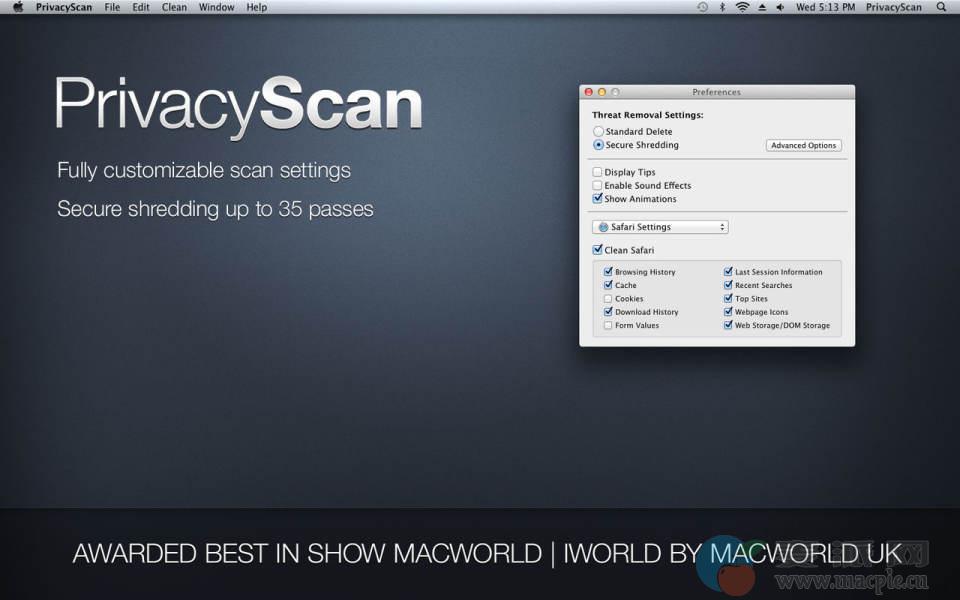 PrivacyScan使用高级安全删除算法,该算法符合并超出美国国防部的建议,以确保完全删除Apple计算机的敏感数据。私有文件一旦删除就会保密。