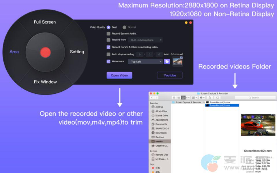 Screen Capture & Recorder是一个完美的屏幕录制软件,其核心功能是记录您的Mac上发生的一切,同时记录来自麦克风和计算机声音的音频。Screen Capture & Recorder还支持视频编辑器修剪录制的视频或其他视频文件,如mov、mp4、m4v。