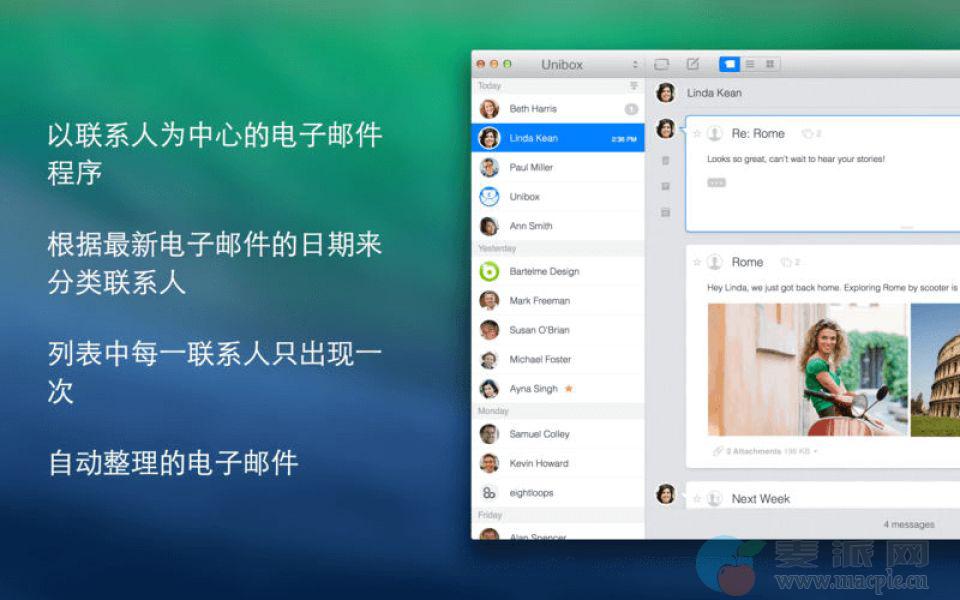 Unibox漂亮的界面、新鲜的使用方式使电子邮件不像以前那样枯燥乏味,成为Mac上深受欢迎的电子邮件应用。