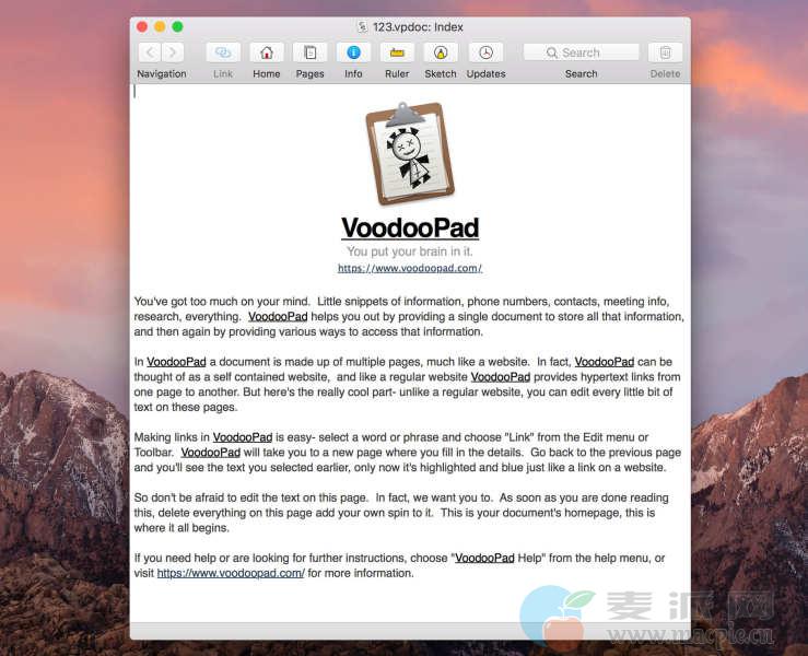 VoodooPad是一个写下你的笔记和想法的地方。想法,图片,列表,密码,你妈妈的苹果派食谱。包括你需要跟踪和组织的任何东西,VoodooPad将会与你一起成长,而不会妨碍你的发展。