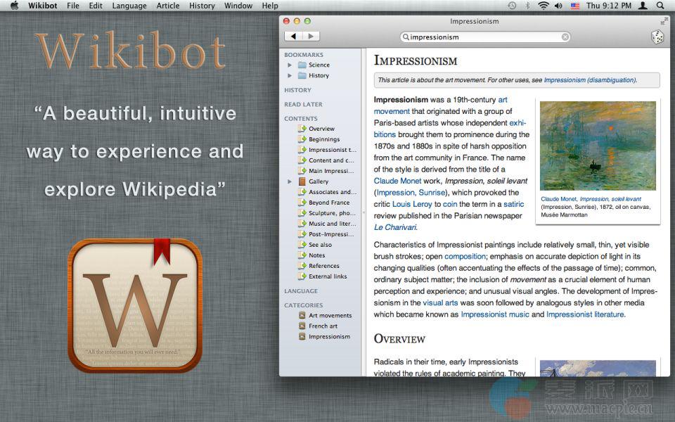 wikibot使阅读维基百科的文章在你的MAC的喜悦。制作精美的界面,可定制的显示选项,和杀手的特征标签浏览,语言切换,以后阅读可以添加到离线缓存队列中。