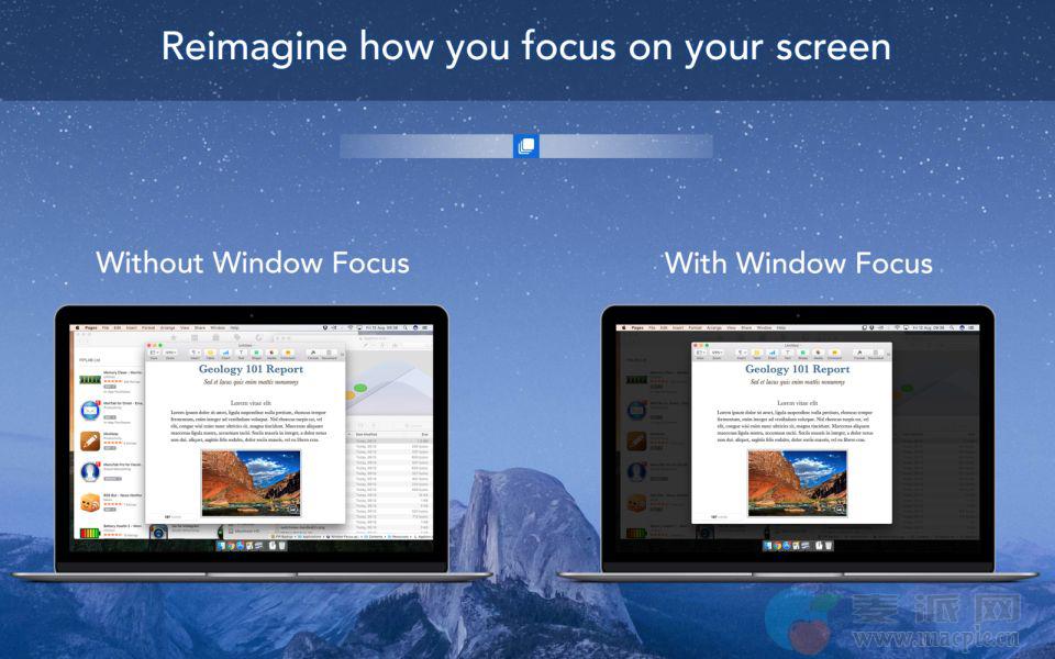 Window Focus在mac电脑上将我们需要的指定应用程序窗口突出显示在最前面,然后将其他应用窗口统统隐藏起来,这样整个屏幕上只剩下制定突出显示的窗口,让我们将注意力集中在当前窗口而免受其他应用程序内容的干扰。