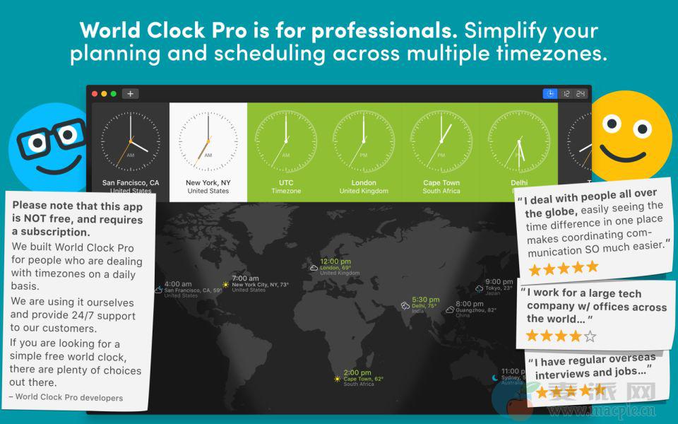 World Clock for Mac是一款简单而强大的世界时钟,它增加城市和时区像GMT和UTC。拖移光标显示国际转换时间。可以安排国际长途电话和会议,并将它们添加到您的日历。