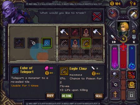 游戏包含了永久死亡要素,每次重新开始游戏英雄面对的都是完全重新随机生成的地城内容和怪物组合,你不仅要尽可能深入的探索,还要面对诡异而且致命的怪物组合;