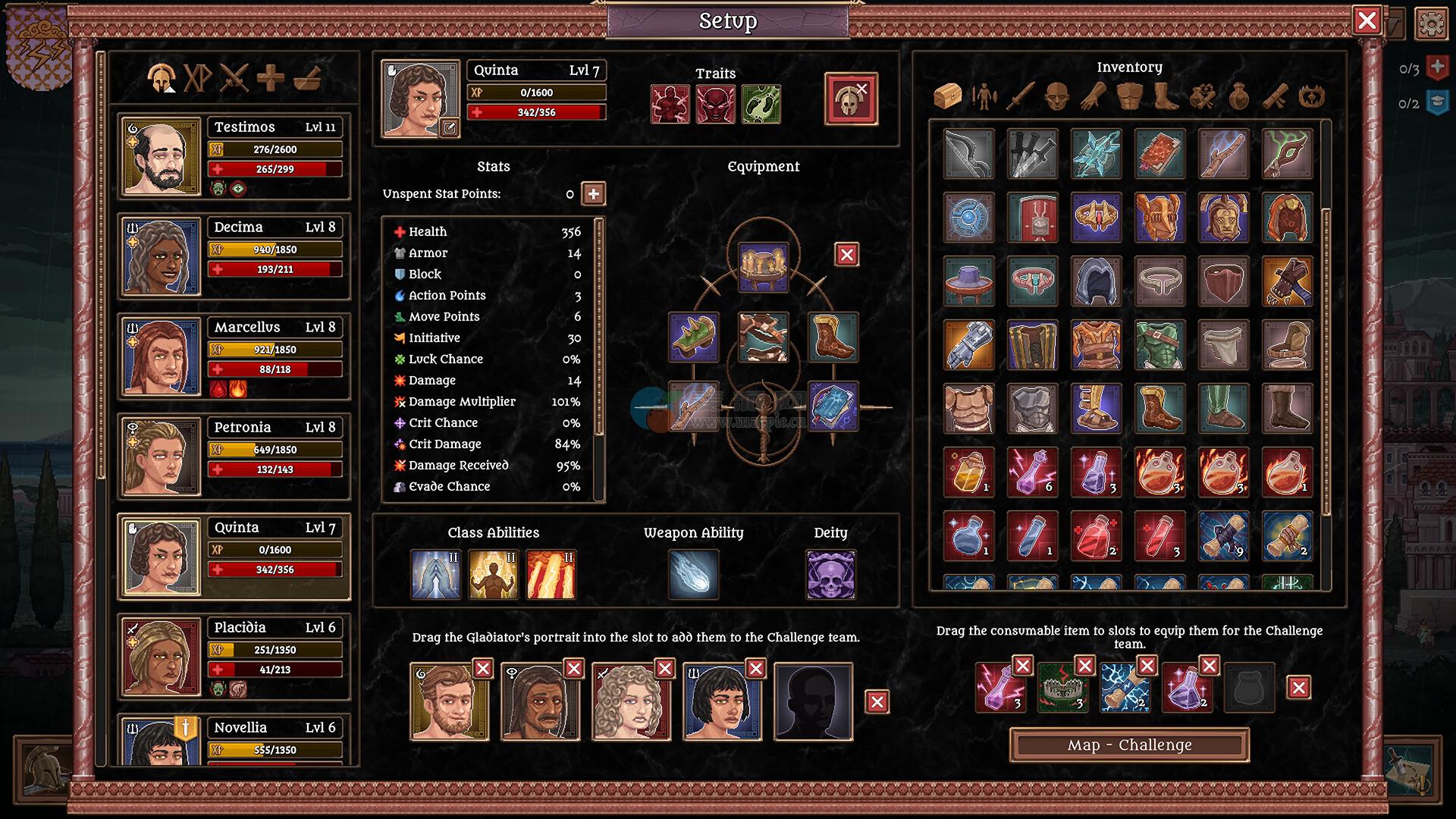 提升角斗士等级、强化其属性、习得新技能,确保战前准备充分。别忘了处理角斗士的负面状态或创伤,并为他们装备闪亮的新武器、护甲和消耗品。