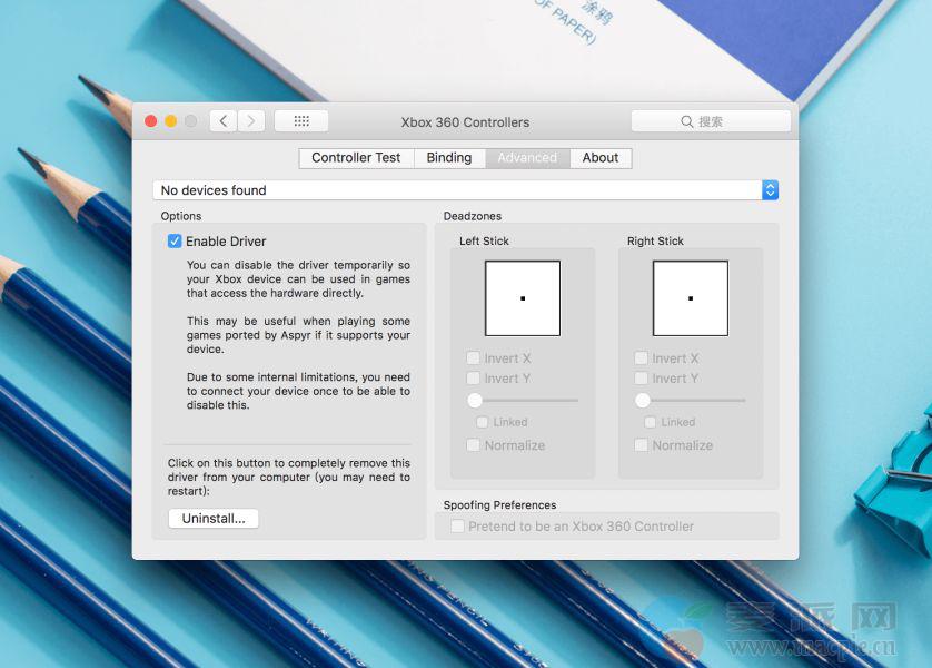 Xbox 360控制器驱动程序软件归档附带了一个安装程序包,可以将部署过程简化为仅按照说明操作。请记住,您需要重新启动您的Mac才能完成安装。一切就绪后,您将可以通过系统偏好设置窗口访问Xbox 360控制器面板。在那里您将能够看到当前连接的Xbox控制器并测试按钮是否工作。相同的区域为您提供反转左侧或右侧摇杆的X或Y轴的可能性,调整移动精度或交换摇杆。